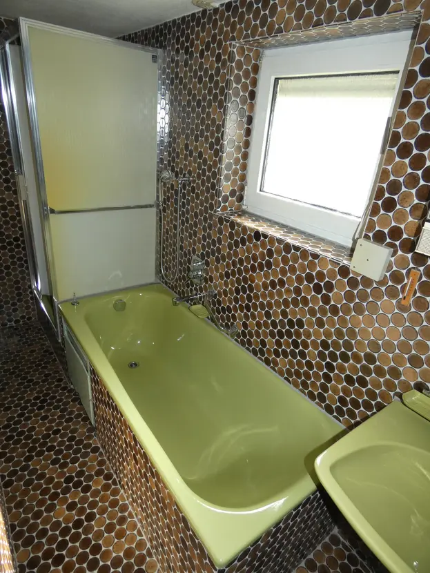 Das Bad befindet sich im Untergeschoss und befindet sich im Zustand der 70er-Jahre.